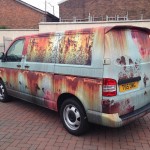 Taking exact measurements of the entire van over and above the blueprints we already held ensured rust could look like it had ran from door frames, handles, badges and mirrors as well as adding extra fake metal panels that look like they are riveted onto the smooth new van. The more distressed we made it look – the better the end result of the rust!